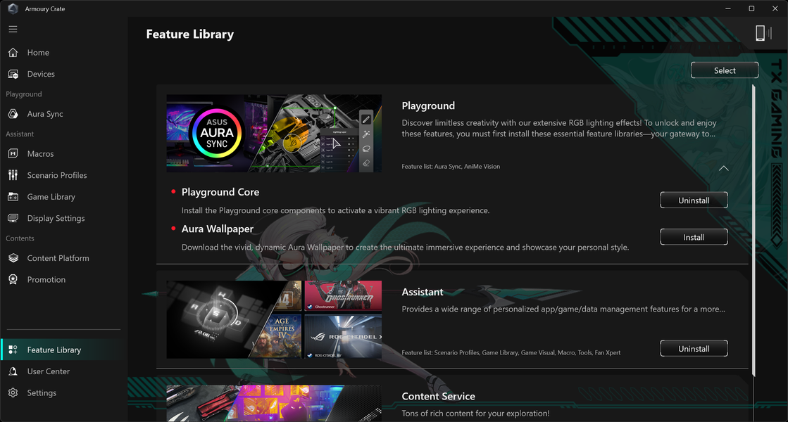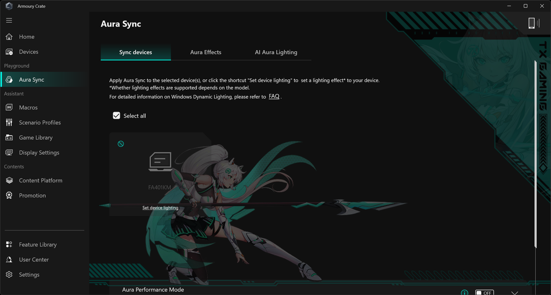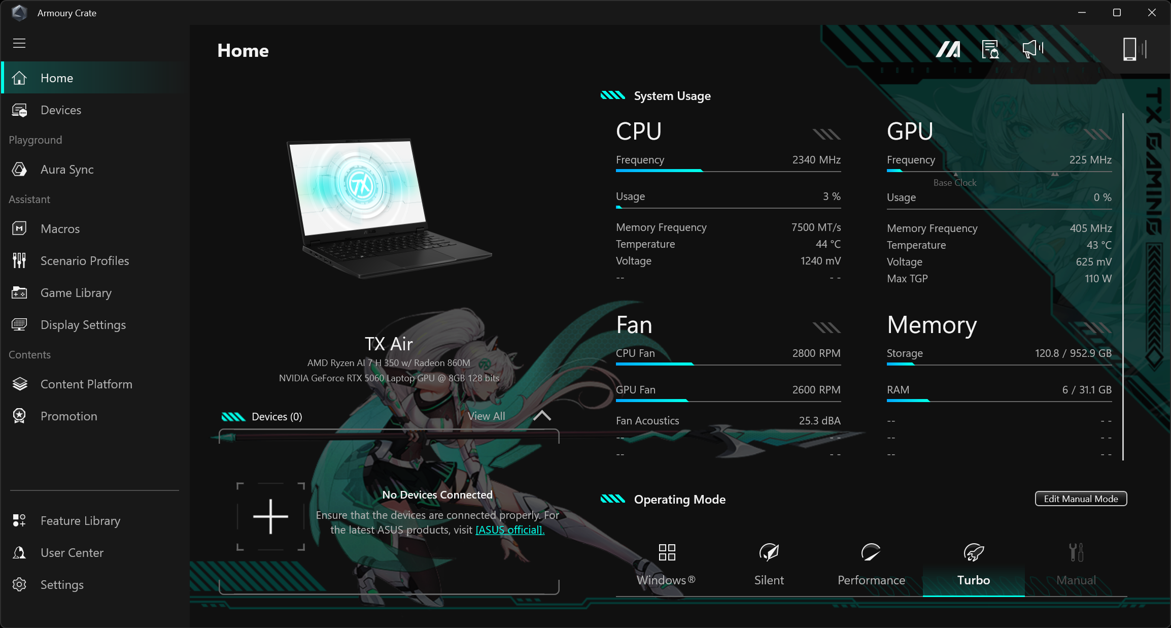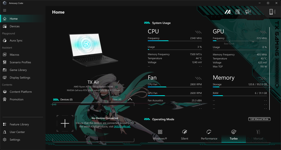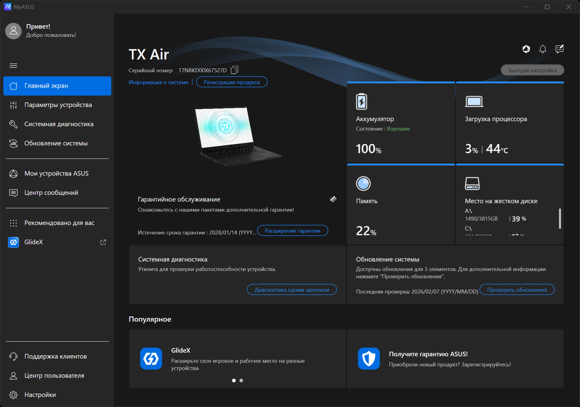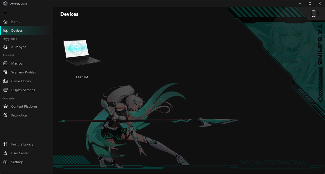 Asus TX Air FA401K поставляется с установленной ОС Windows 11 Home и фирменными утилитами Armour Crate и MyAsus.