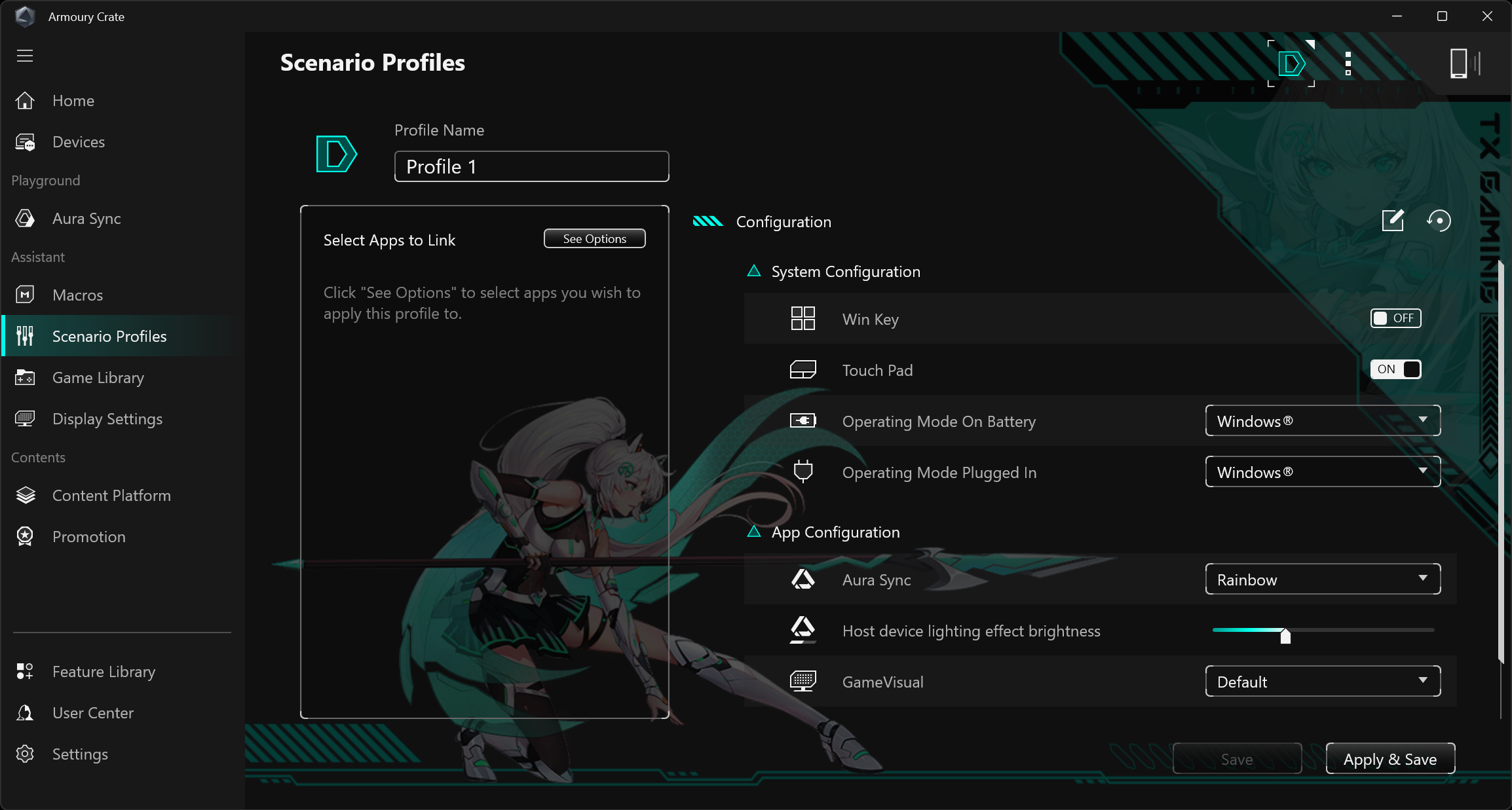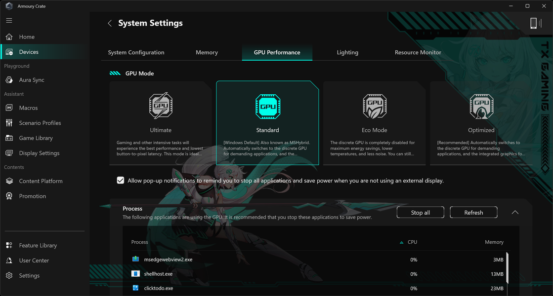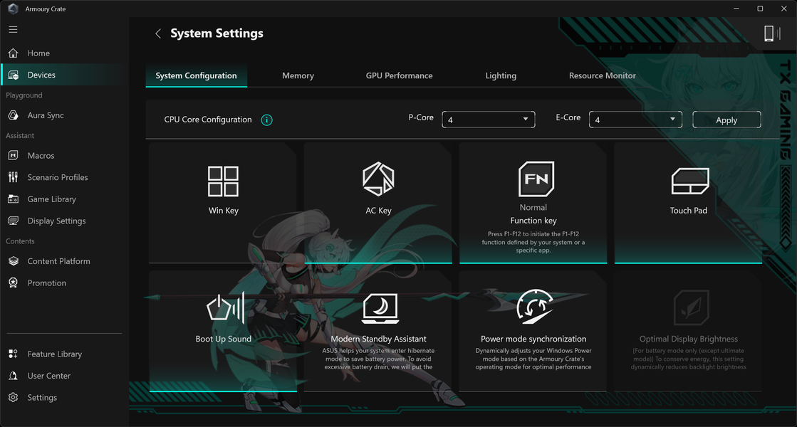 В разделе Devices получаем доступ к подменю установок системы. Его первая позиция — System Configuration (Конфигурация системы). Здесь можно определить судьбу клавиши Windows, поведение регистра Fn, кликпада, аудио. Имеются также Modern Standby Assistant (ассистент по отключению компонентов системы в режиме сна) и Power Mode Synchronization (синхронизация режима питания).