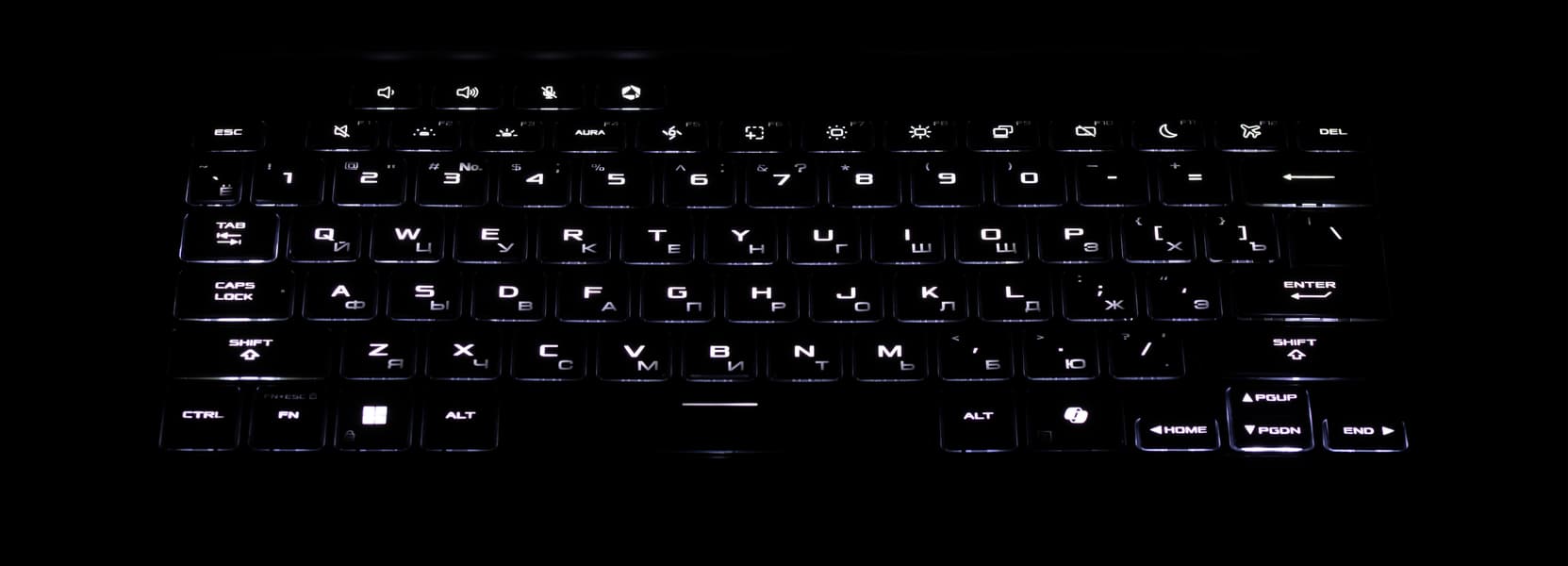 Клавиатура снабжена трехуровневой по яркости подсветкой (четвертое состояние — подсветка выключена); увеличение яркости производится повторным нажатием аккорда Fn+F3, уменьшение — Fn+F2. Все символы и торцы кнопок подсвечиваются одинаково.