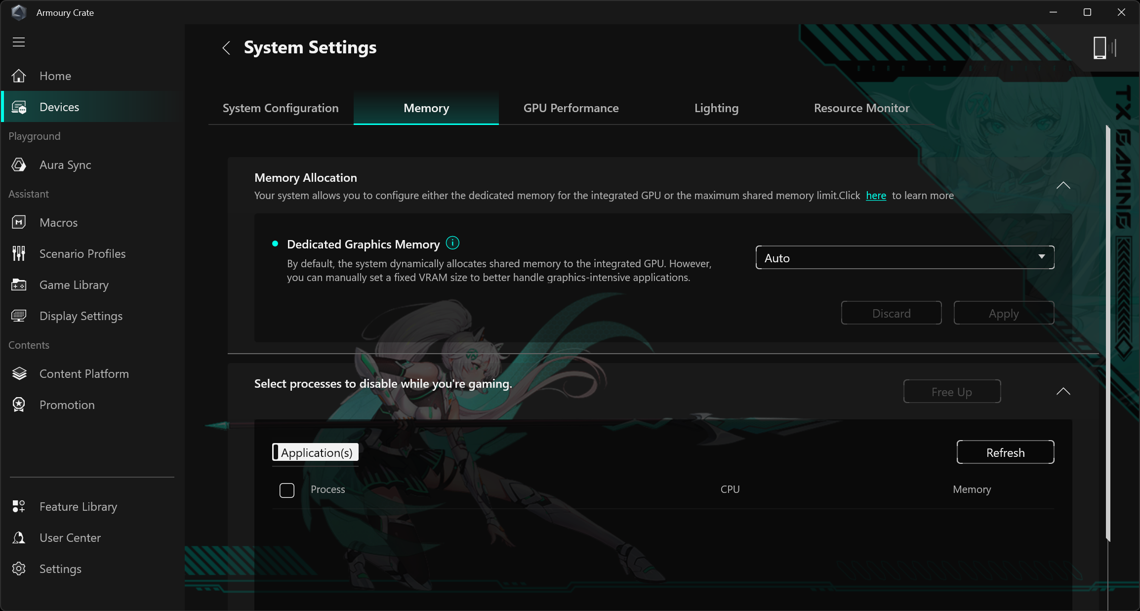 Раздел Memory (память) дает возможность назначить объем ОЗУ для интегрированной графики, а также перераспределить его между отдельными запущенными процессами.