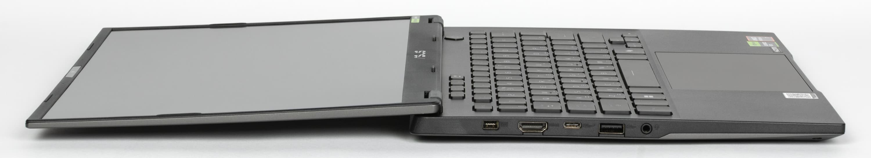 Максимальный угол раскрытия ноутбука составляет более 180°, но уложить откинутую крышку с опорой на плоскость стола не удается: максимальному раскрытию препятствует выступающая задняя часть основания. Понятно, что такая конструкция способствует беспрепятственной эвакуации горячего воздуха из внутреннего объема корпуса, но выявляет известные ограничения.