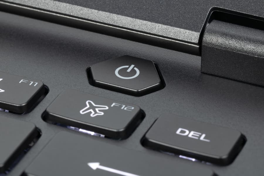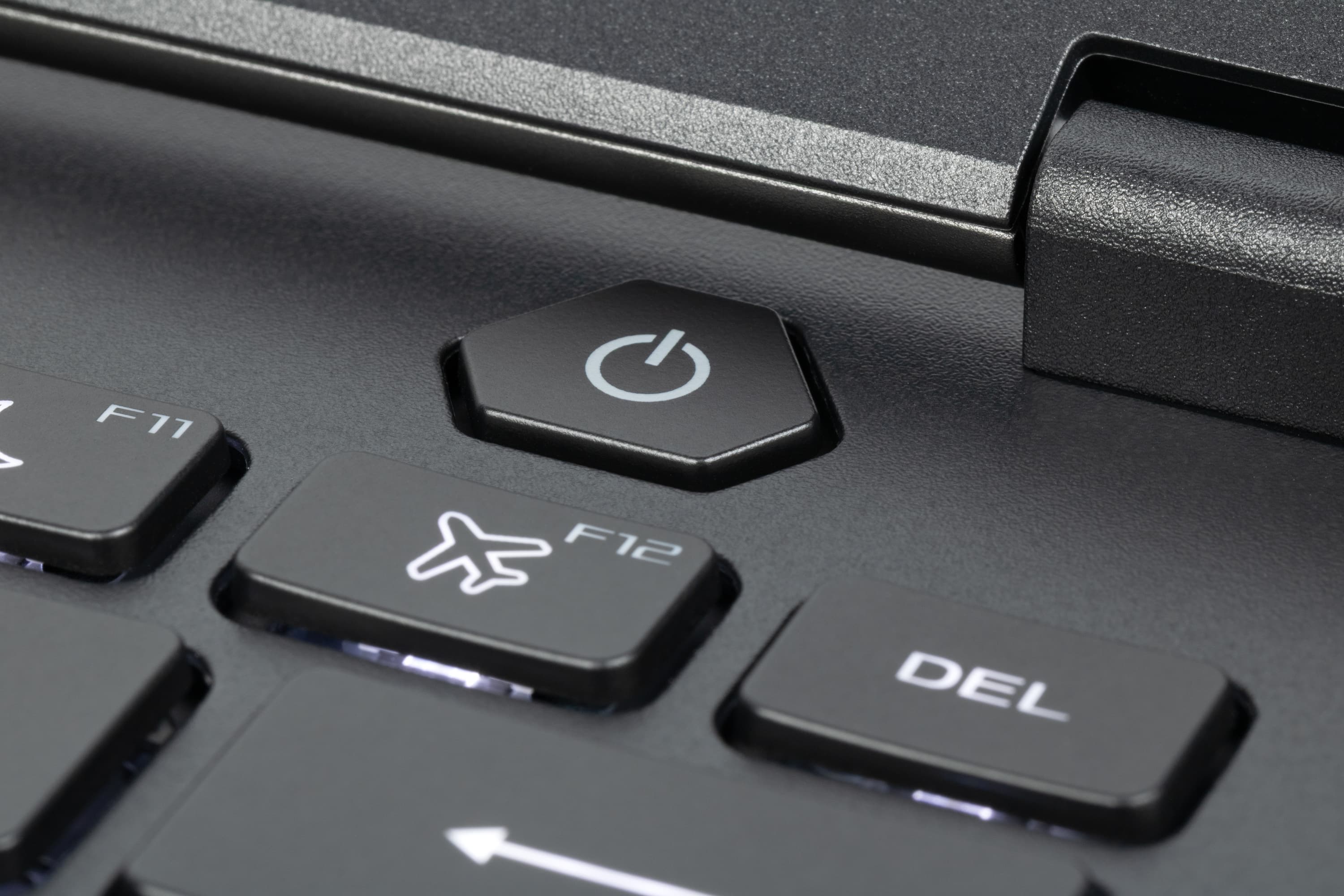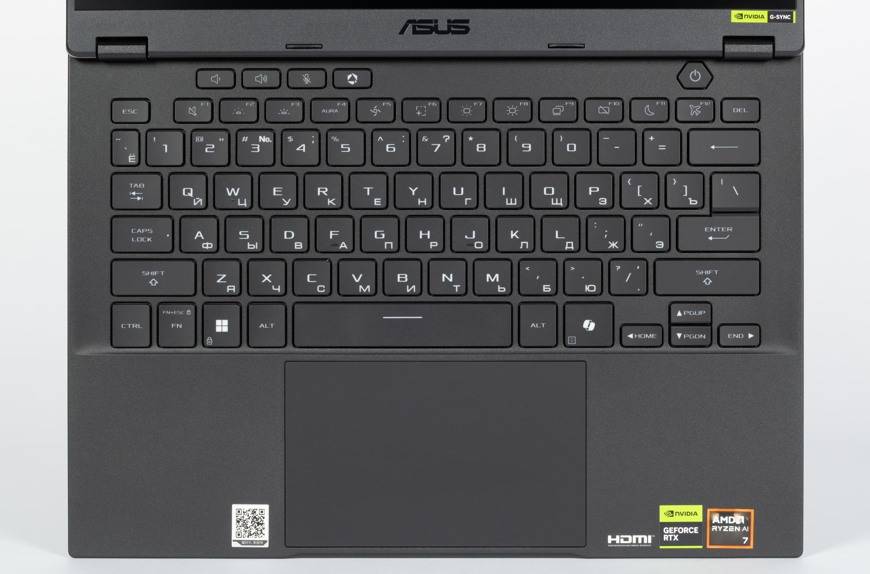 Выключатель питания расположен над верхним рядом алфавитно-цифровых кнопок. По форме он напоминает «гроб в разрезе» — это характерная черта игровых ноутбуков Asus серии ROG. Благодаря локализации и необычному виду его нельзя перепутать с другими и нажать по ошибке.