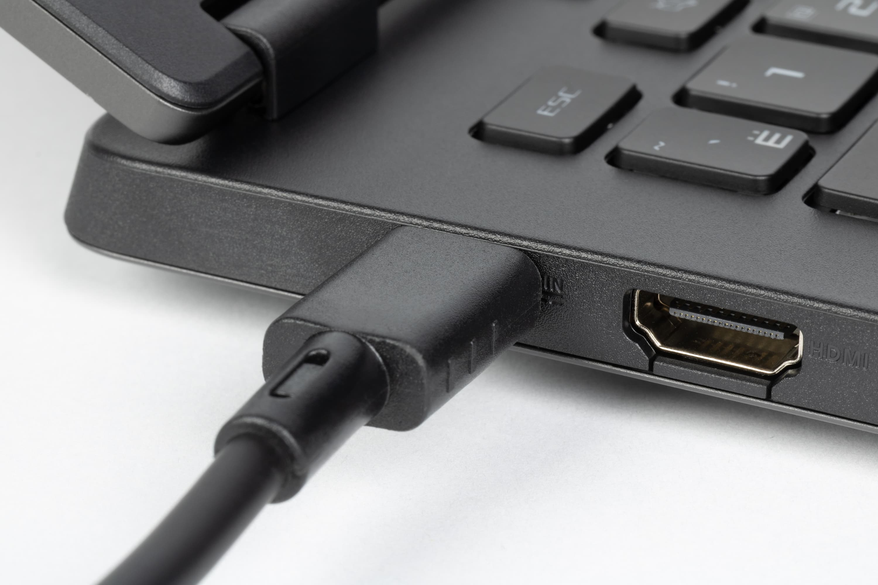 Слева расположены проприетарный разъем для подключения адаптера питания, видеовыход HDMI, порты Thunderbolt 4, USB 3.2 Gen2 Type A, а также комбинированный аудиоразъем для подключения аудиогарнитуры.