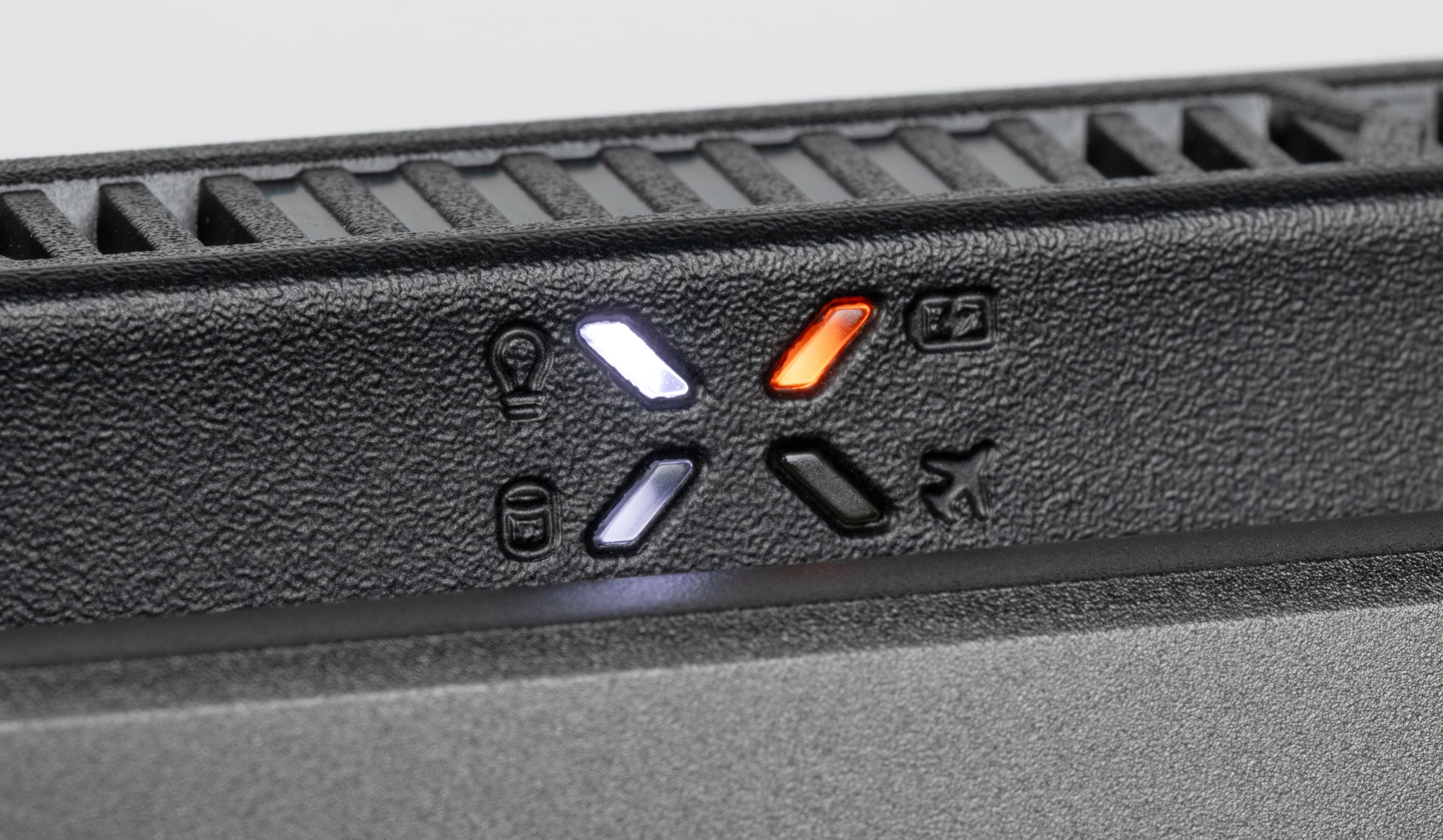 За нижней кромкой экрана на корпусе размещен блок светодиодных индикаторов, сигнализирующих о подключенном адаптере питания, состоянии заряда аккумулятора, активности системного накопителя и активации режима «в самолете», когда отключена беспроводная связь.