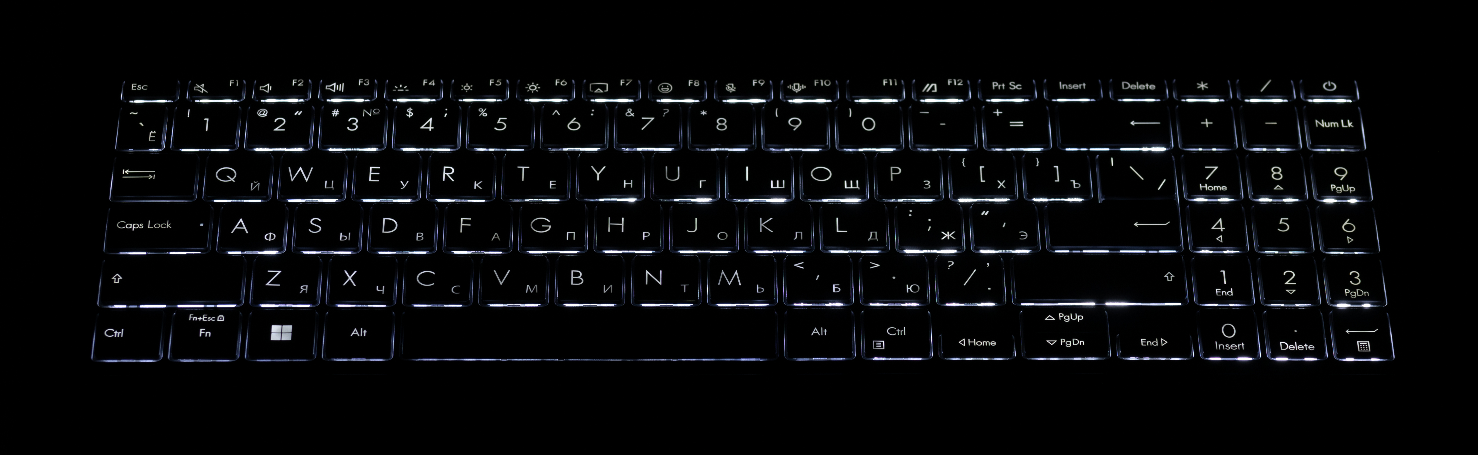Клавиатура обладает подсветкой с четырьмя уровнями интенсивности и выбором цвета свечения. Управление яркостью производится повторными нажатиями аккорда Fn+F4. Подсвечиваются сами символы на клавишах и немного — их контуры. Зона подсветки под каждой клавишей освещена неярко и не раздражает. Распределение света позволяет без труда различить и латиницу, и символы национального алфавита.