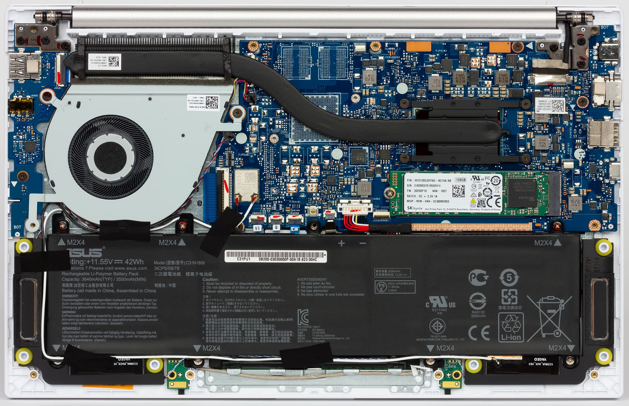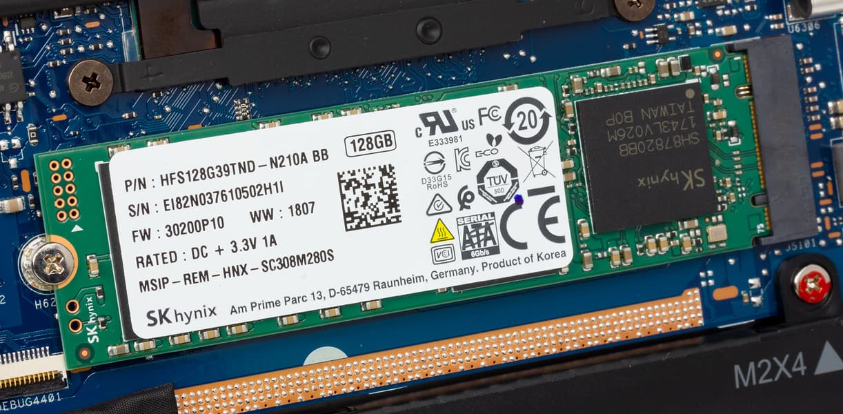 Подсистема хранения данных ноутбука может различаться объемом SSD-накопителя. В нашем варианте в ноутбуке был установлен SSD HFS128G39TND-N210A емкостью 128 ГБ с интерфейсом SATA. Могут также устанавливаться SSD емкостью 256 или 512 ГБ, но во всех случаях интерфейс накопителя будет SATA.