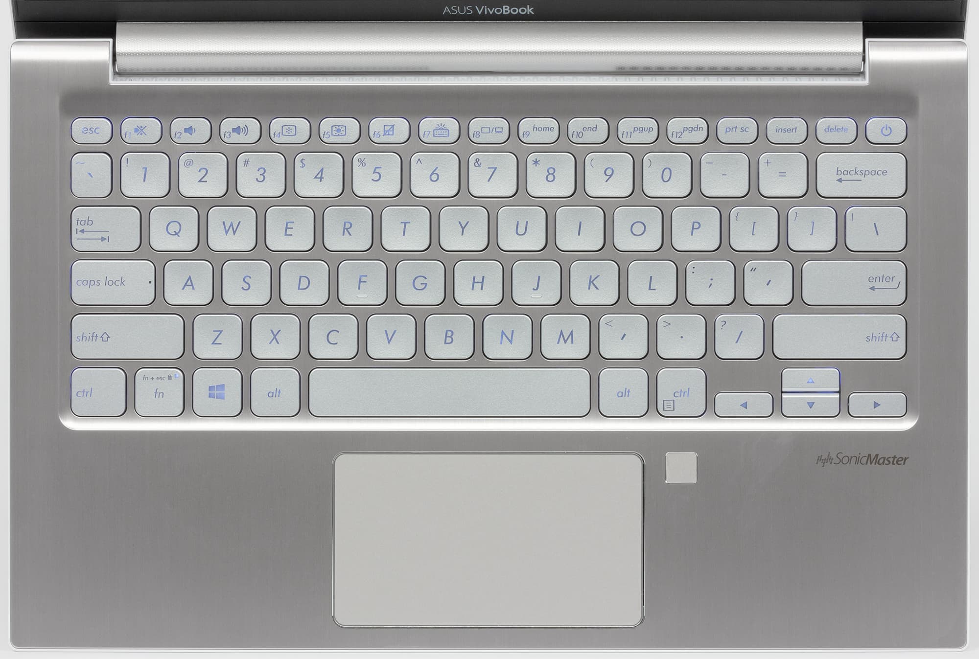 Клавиатура в этом ноутбуке такого же цвета, как и сам ноутбук, то есть серебристая (под металл). Подробно о ней, как и о тачпаде, мы расскажем чуть позже.