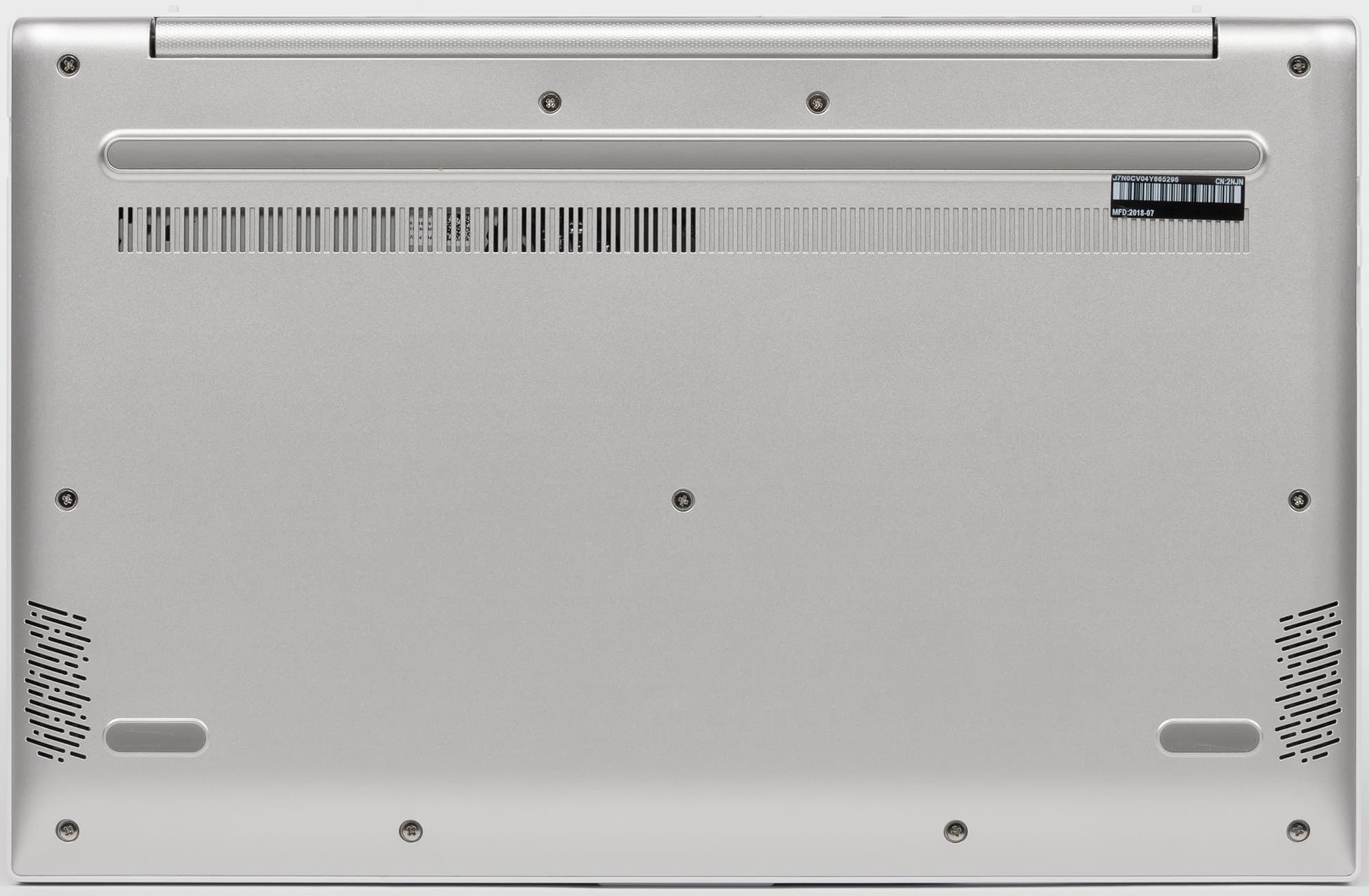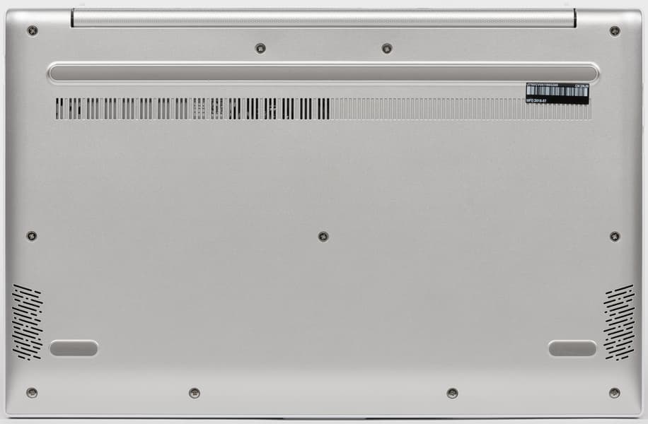 На нижней панели ноутбука имеются резиновые ножки, вентиляционные отверстия и сетки, закрывающие динамики.