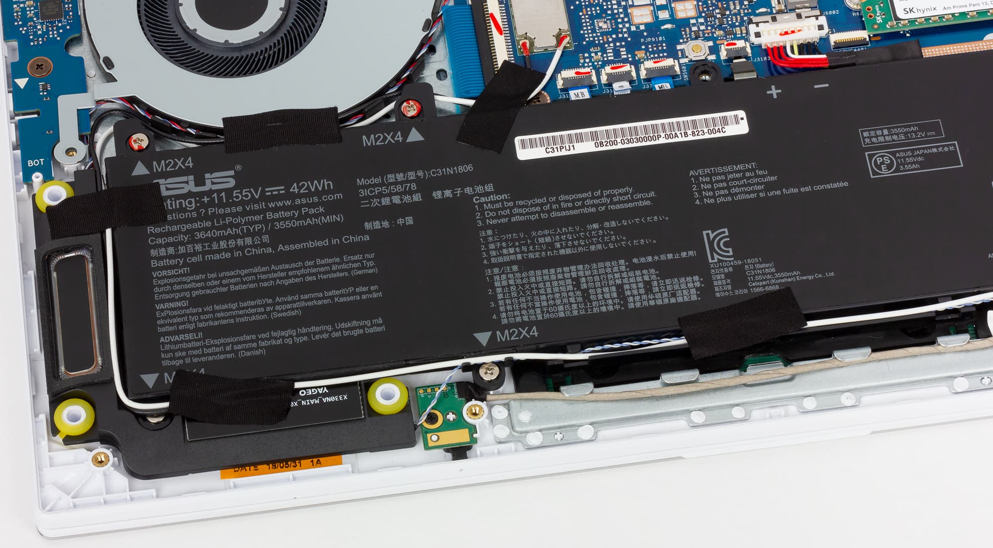 За автономную работу Asus VivoBook S13 S330UA отвечает трехэлементная аккумуляторная батарея емкостью 42 Вт·ч, которая, по данным компании, обеспечивает до 12 часов работы в автономном режиме. Для батареи реализована технология быстрой зарядки: до 60% она заряжается за 49 минут.
