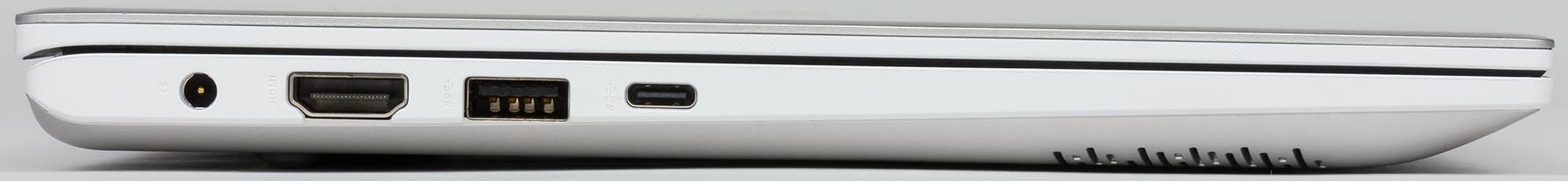 На левом торце корпуса расположены: порт USB 3.0 Type-С, порт USB 3.0 Type-A, видеовыход HDMI и разъем питания.