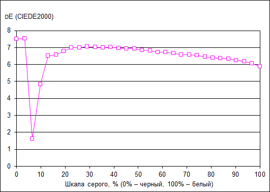 С точностью цветопередачи (дельта Е) дела обстоят не очень хорошо. Значение дельта Е находится в диапазоне от 6 до 7 (темные области можно не учитывать), что является посредственным результатом для данного класса экранов.