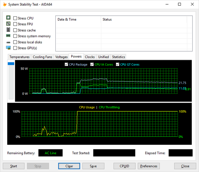 Температура процессора стабилизируется на уровне 82 °C, а мощность — на уровне 21 Вт.