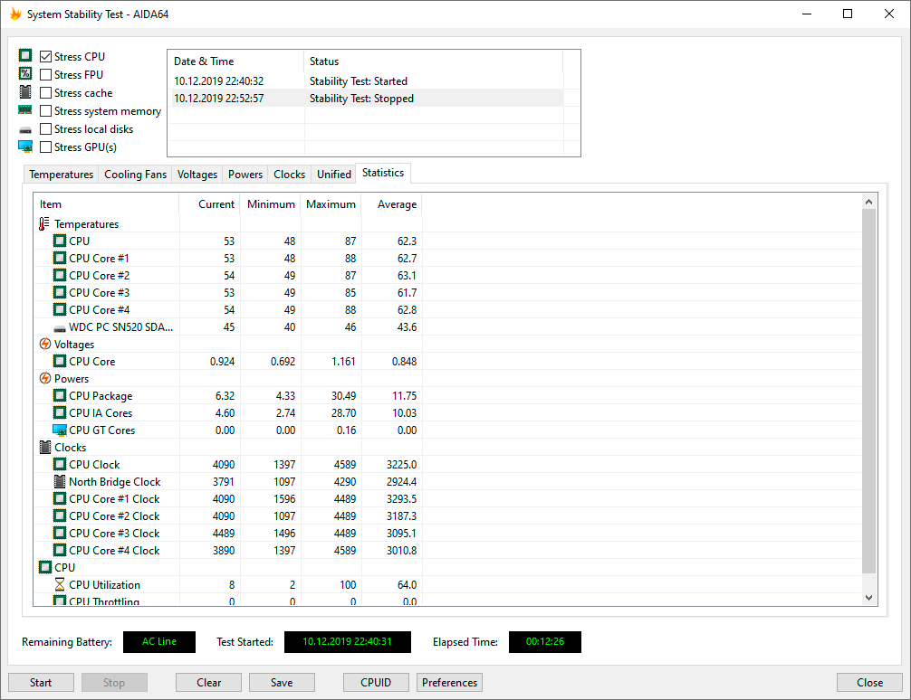 Максимальная температура процессора быстро достигла 87 °C, а затем заработавшая турбина системы охлаждения стабилизировала ее на 64-66 °C. Частота процессора в нагрузке изменялась в диапазоне 2,8—3,2 ГГц при напряжении 0,905 В и уровне потребления 14—16 Вт. В режимах невысокой нагрузки процессор кратковременно «выстреливал» до 4,6 ГГц при пиковом напряжении 1,161 В и потреблении 30 Вт. Добавим, что уровень шума при работе ноутбука в данном режиме был выше среднего, но не раздражал. Без нагрузки ноутбук работает бесшумно.