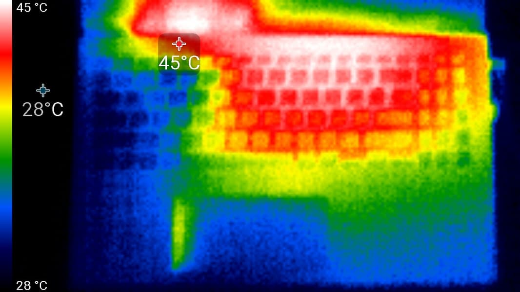 Под максимальной нагрузкой работать с клавиатурой комфортно, так как в данном случае места под запястьями практически не греются, едва ощутимый нагрев можно почувствовать только с правой стороны. Нагрев снизу хорошо ощущается коленями, в первую очередь правым, но в целом работать с ноутбуком на коленях можно без особого дискомфорта. Блок питания греется умеренно.