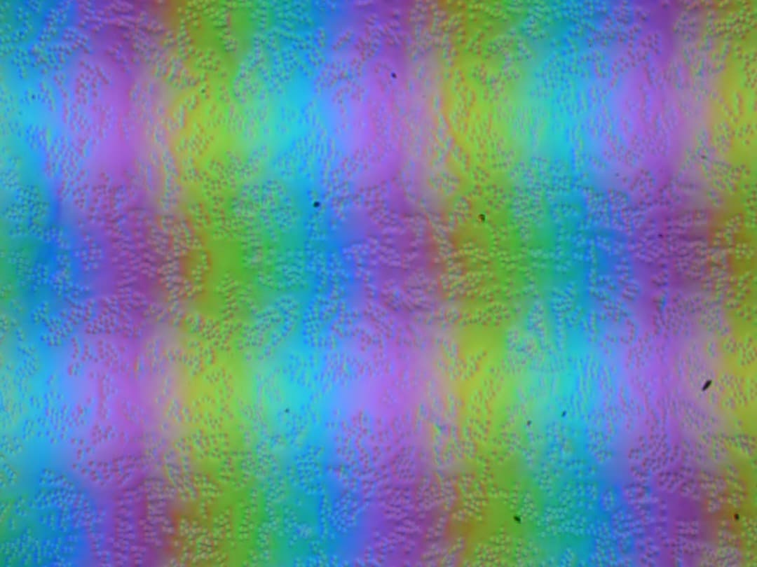 Зерно этих дефектов в несколько раз меньше размеров субпикселей (масштаб этих двух фотографий примерно одинаковый), поэтому фокусировка на микродефектах и «перескок» фокуса по субпикселям при изменении угла зрения выражены слабо, из-за этого нет и «кристаллического» эффекта.