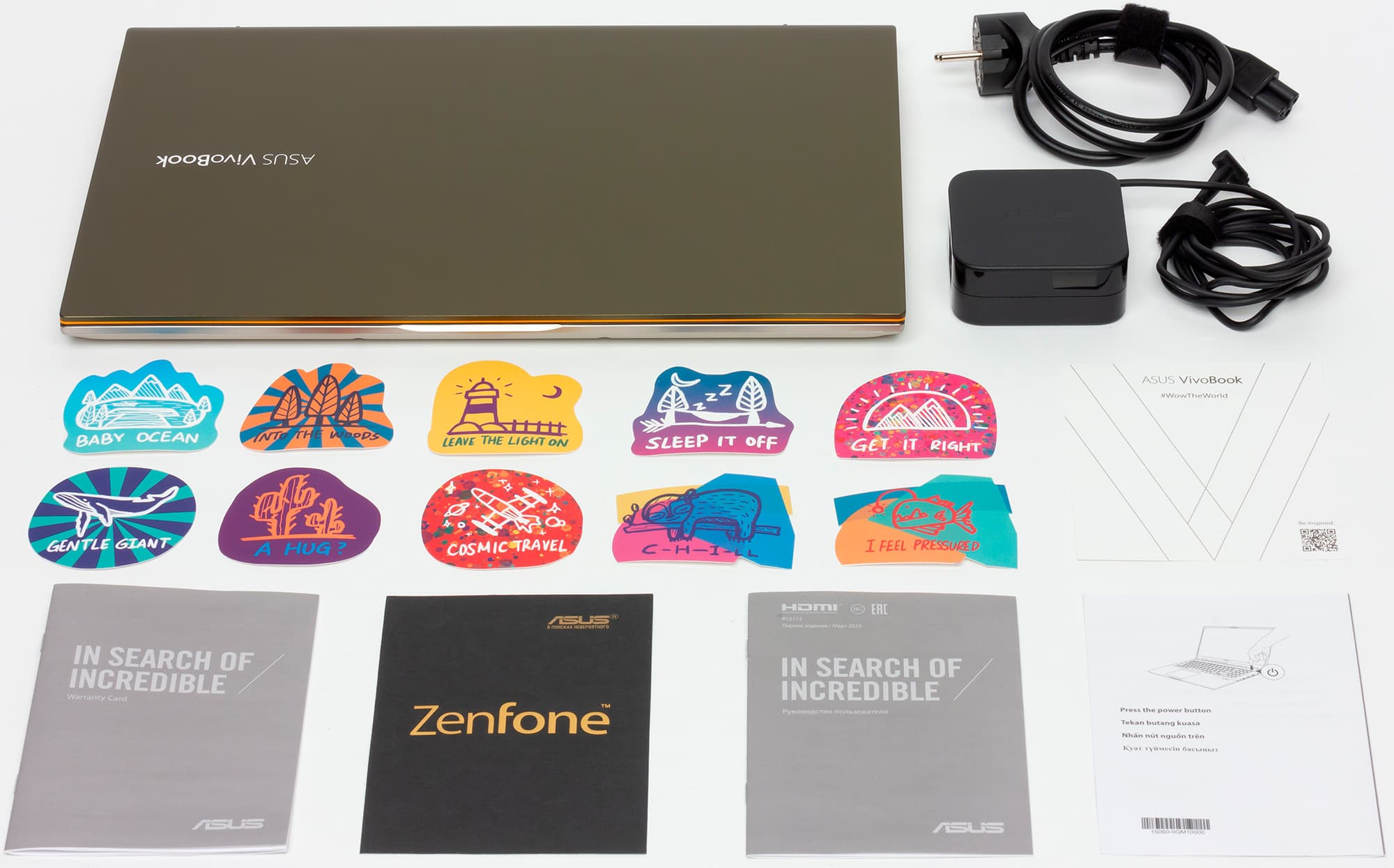 Молодежную ориентацию Asus VivoBook S532F подчеркивает его комплектация, где помимо привычных адаптера с кабелями и инструкций включены десять стикеров с комичными изображениями и слоганами.