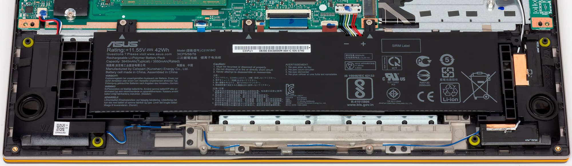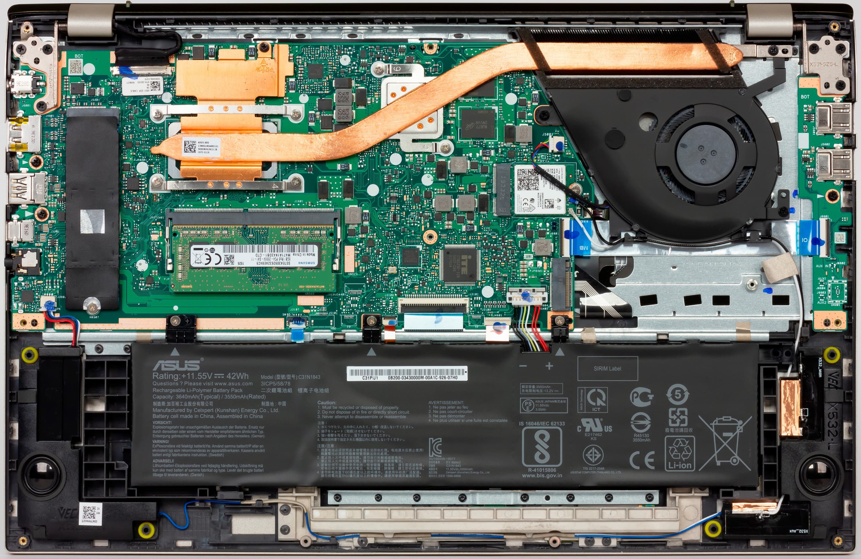 Аппаратная компоновка Asus VivoBook S532F разительно отличается от компоновки ZenBook 14 UX434F. Здесь иначе сориентирована сама материнская плата, процессор с системой охлаждения, память и накопители. Только аккумулятор установлен в привычном месте ближе к переднему краю.