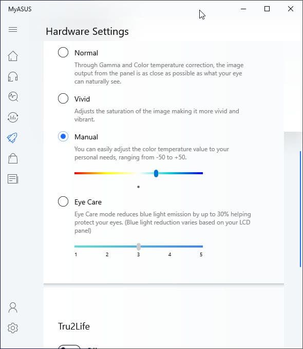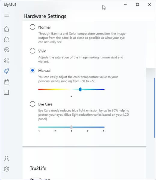 Ноутбук сопровождается фирменной утилитой MyAsus, на вкладке которой можно изменить ряд настроек основного экрана: выбрать профиль цветокоррекции и вручную подстроить цветовой баланс. Также есть модная функция (Eye Care) для снижения интенсивности синей компоненты (впрочем, в Windows 10 она и так есть). Почему такая коррекция может быть полезной, рассказано в статье про iPad Pro 9,7″. В любом случае, при работе за ноутбуком на ночь глядя лучше снизить яркость экрана до минимального, но еще комфортного уровня. Желтить картинку нет никакого смысла.