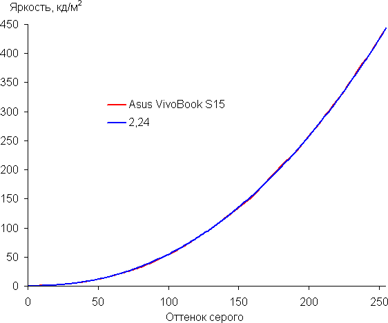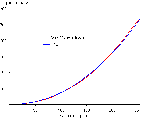 Аппроксимация полученной гамма-кривой дала показатель 2,10, что немного ниже стандартного значения 2,2, при этом реальная гамма-кривая немного отклоняется от аппроксимирующей степенной функции: