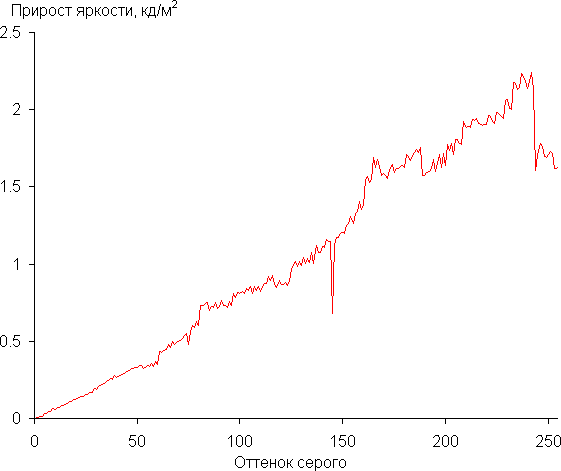 Для основного экрана мы измерили яркость 256 оттенков серого (от 0, 0, 0 до 255, 255, 255). График ниже показывает прирост (не абсолютное значение!) яркости между соседними полутонами: