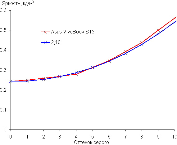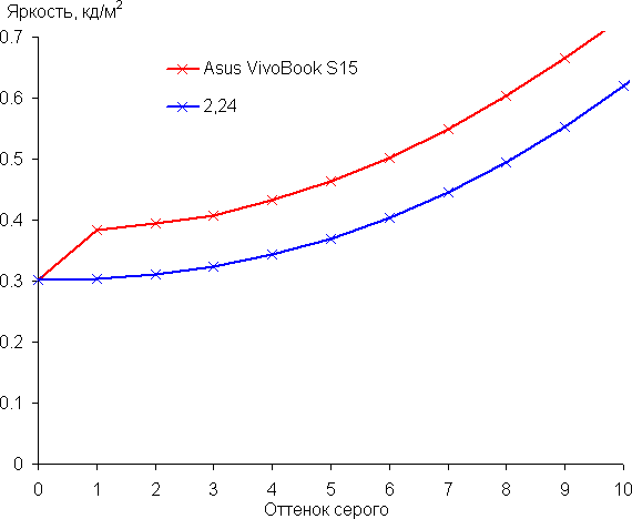 Рост прироста яркости на шкале серого в данном случае более-менее равномерный. В самой темной области хорошо различаются все оттенки, но первый оттенок серого уже слишком яркий:
