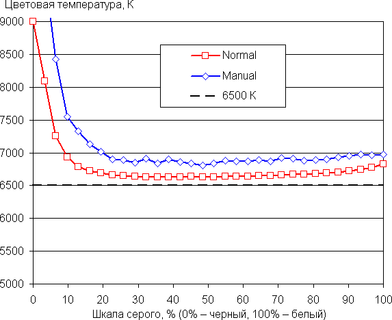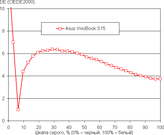У обоих экранов по умолчанию баланс оттенков на шкале серого компромиссный, так как у основного великовато отклонение от спектра абсолютно черного тела (ΔE), а у экрана-тачпада высоковата цветовая температура. Но критичными эти отклонения от идеала не являются. Также мы попытались ползунком цветовой температуры скорректировать цветовой баланс основного экрана, но ничего хорошего из этого не вышло. (Самые темные области шкалы серого можно не учитывать, так как там баланс цветов не имеет большого значения, да и погрешность измерений цветовых характеристик на низкой яркости большая.)