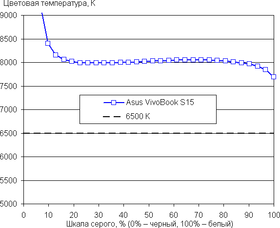 Подведем итоги. Основной экран ноутбука Asus VivoBook S532F не очень яркий, поэтому ноутбуком будет сложно пользоваться ясным днем на улице даже в тени. Экран-тачпад заметно ярче. В полной темноте яркость обоих экранов можно понизить до комфортного уровня, но делать это придется вручную и для каждого экрана отдельно. Цветовой баланс у обоих экранов неидеальный, но приемлемый, контрастность высокая, а вот равномерность черного у основного экрана средняя. Мерцания нет ни у того, ни у другого, углы обзора хорошие. К недостаткам обоих экранов можно отнести низкую стабильность черного к отклонению взгляда от перпендикуляра к плоскости экрана.
