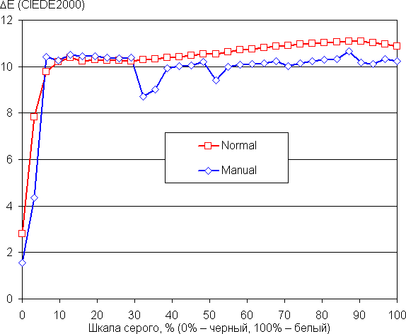 Рост прироста яркости на большей части шкалы серого более-менее равномерный, и только в светах этот характер нарушается. Однако каждый следующий оттенок значимо ярче предыдущего, в том числе и в самой темной области: