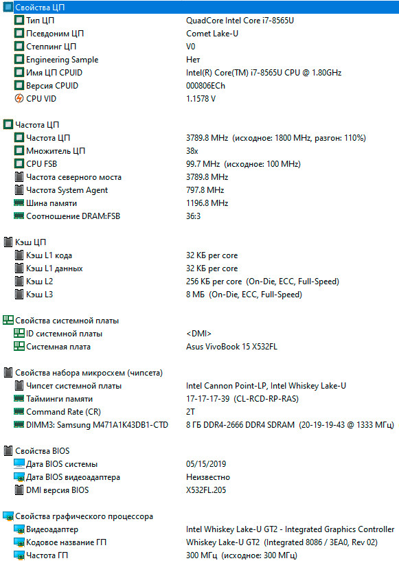 | Процессор | Intel Core i7-8565U (Comet Lake, 1,8 ГГц (с Turbo Boost до 4,6 ГГц), 4 ядра, кэш 8 МБ, 25 Вт) | |