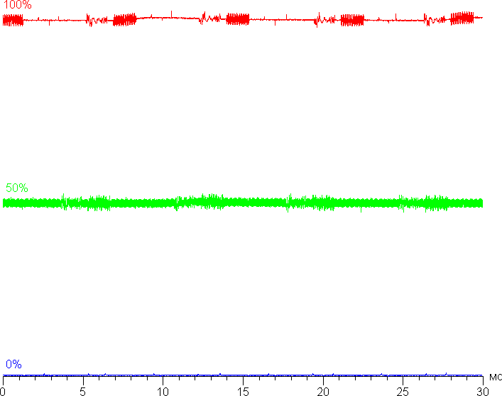 Поэтому визуально цвета имеют естественную насыщенность. Ниже приведен спектр для белого поля (белая линия), наложенный на спектры красного, зеленого и синего полей (линии соответствующих цветов):