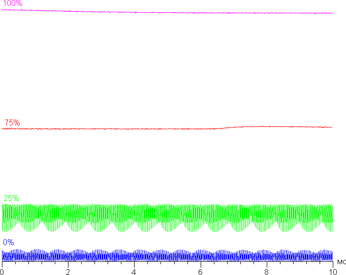 Мерцания (ни видимого, ни выявляемого в тесте на стробоскопический эффект) нет ни на каком уровне яркости ни у основного, ни у дополнительного экрана. Если подходить совсем строго, то зависимости яркости от времени выявляют наличие модуляции, но ее характер (частота, амплитуда, скважность) такой, что никогда и ни при каких условиях мерцание не обнаруживается и не может хоть как-то влиять на зрение пользователя.