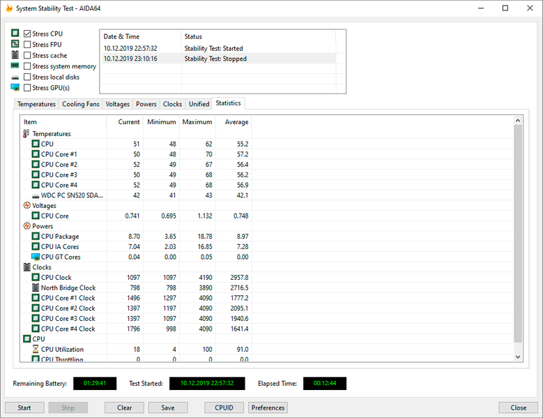 Тесты Asus VivoBook S532F мы проводили в тех же условиях, что и ZenBook 14 UX434F. Для создания нагрузки был использован стресс-тест CPU из последней версии утилиты AIDA64 Extreme. Все тесты проводились под управлением операционной системы Windows 10 Pro x64 с установкой последних доступных драйверов и обновлений. Температура в помещении во время тестирования составляла 24,5-25 °C.