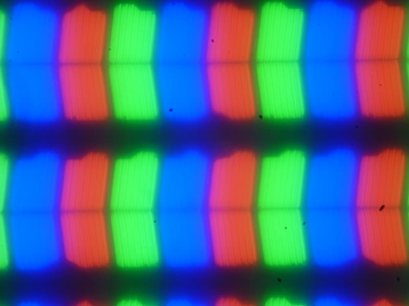 В обоих экранах применяется матрица типа IPS. К сожалению, матовая пленка с относительно крупным зерном не позволяет получить хорошего изображения структуры пикселей в случае экрана-тачпада. Для основного экрана ситуация лучше. Микрофотографии демонстрируют типичную для IPS структуру субпикселей (черные точки — это пыль на матрице фотоаппарата):