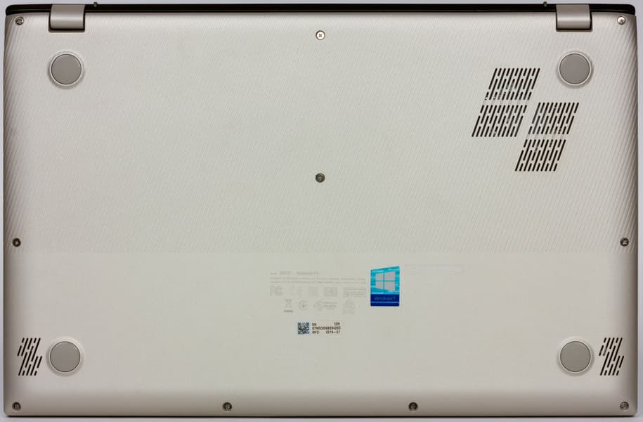 Нижняя панель ноутбука непривычно глухая. На ней есть лишь пара скромных по размерам вентиляционных решеток и две перфорации для акустических колонок.