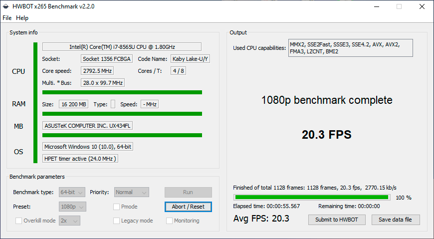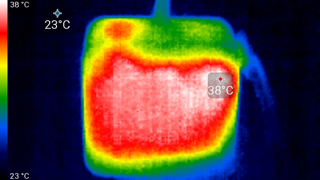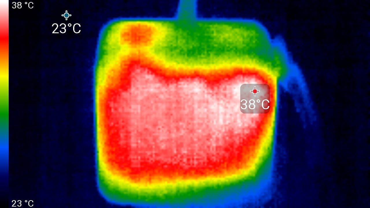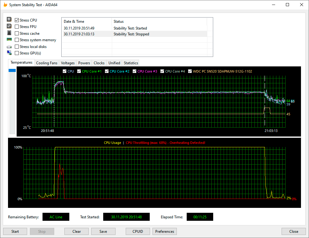 Менее чем за минуту температура процессора достигла 92 °C, но затем активировалась турбина системы охлаждения и с 4,5 ГГц частота снизилась до 2,9-3,1 ГГц, где в «плавающем» режиме продержалась до конца теста. Температура стабилизировалась на 65 °C, а турбина снизила свои обороты до вполне комфортного уровня. Пиковое потребление достигало 31 ватта, а типичное во время нагрузки было ограничено TDP (15 Вт).