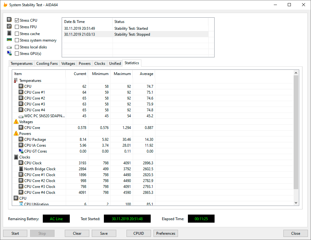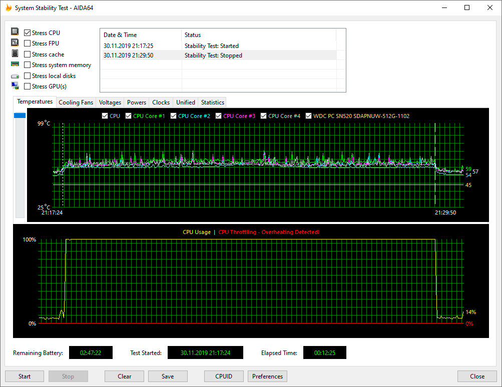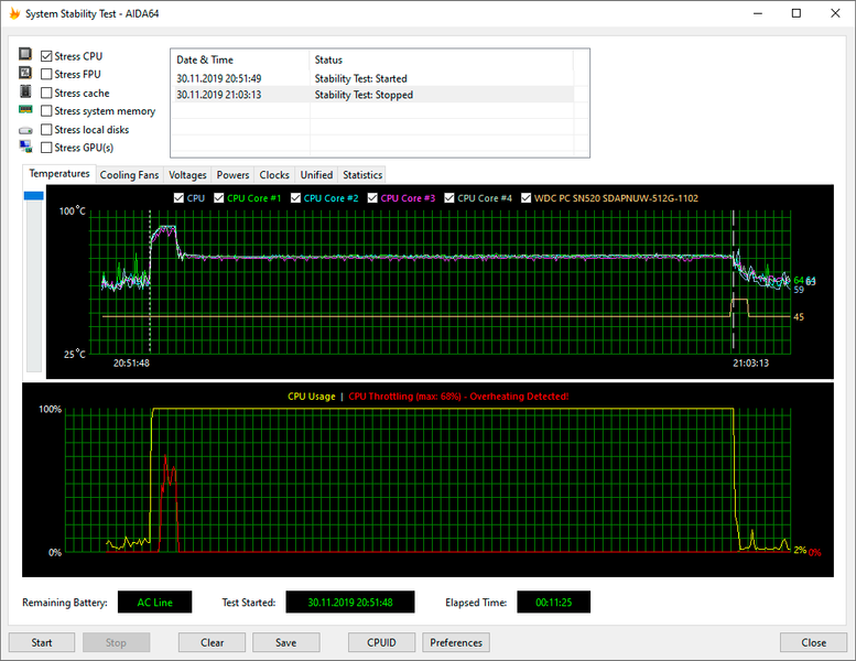 Для тестирования Asus ZenBook 14 UX434F под нагрузкой мы использовали стресс-тест CPU из последней версии программы AIDA64 Extreme. Все тесты проводились под управлением операционной системы Windows 10 Pro x64 с установкой последних доступных драйверов и обновлений. Температура в помещении во время тестирования составляла 25 °C.