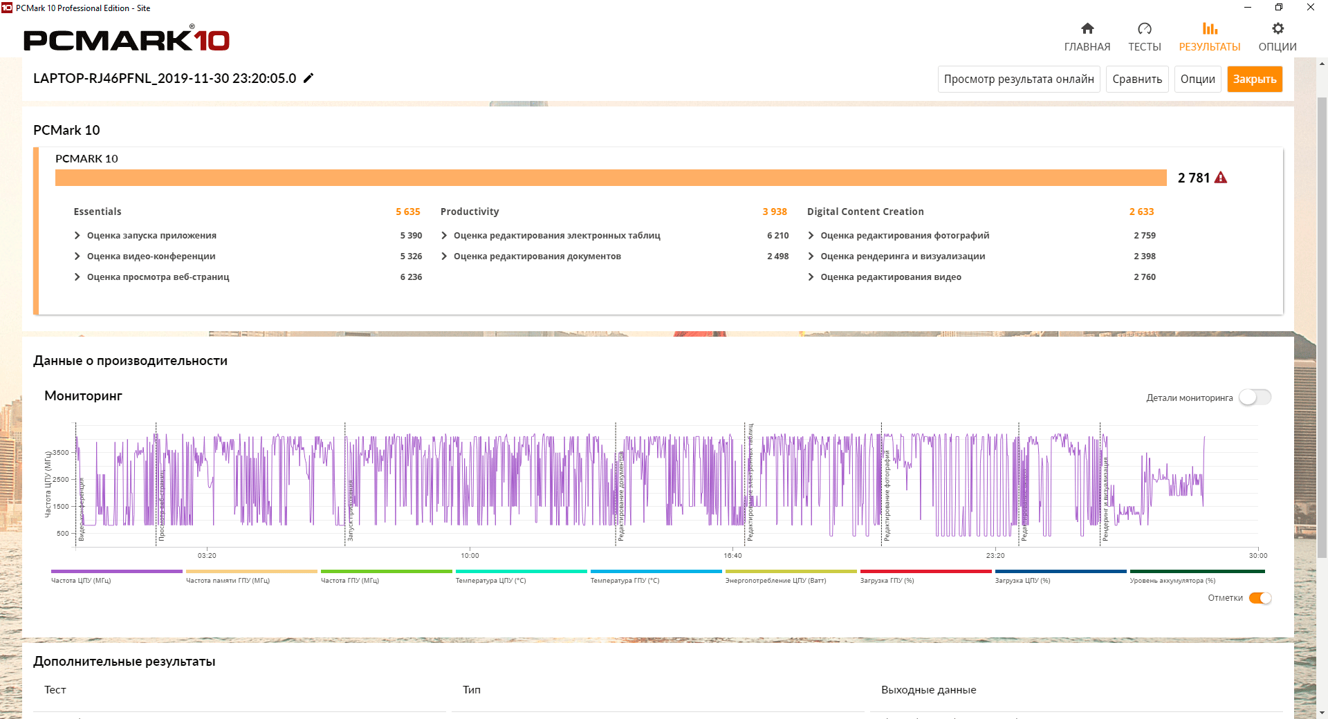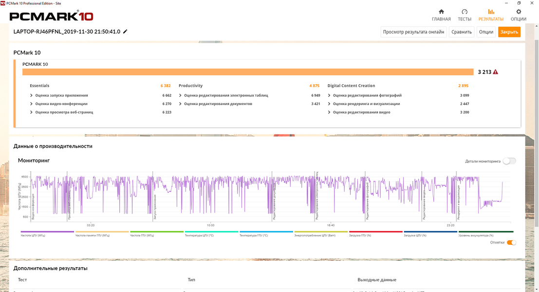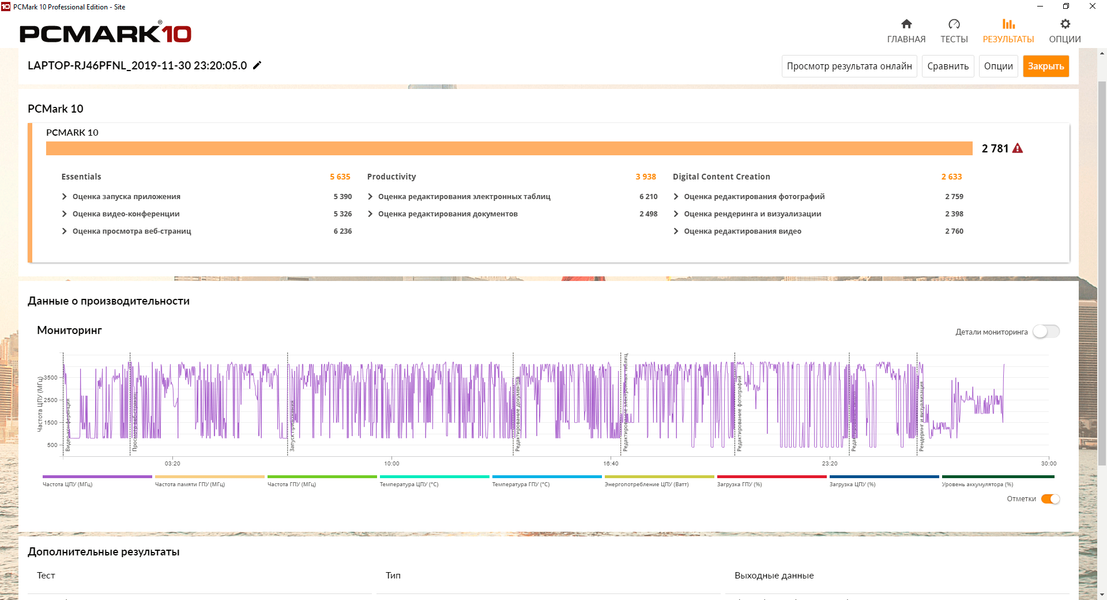 Первый тест мы провели в режиме максимальной производительности с подключенным адаптером питания, получив следующие результаты.