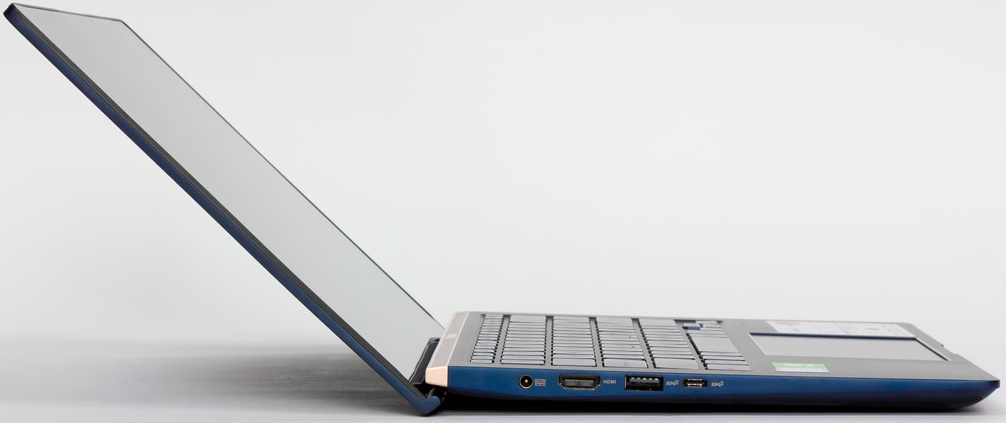 Хотя в спецификациях ZenBook 14 UX434F заявлена тонкая экранная рамка толщиной «всего 2,5 мм», на практике толщина рамки с боков составляет 4,5 мм, а сверху, где размещена HD-видеокамера и микрофоны — 7 мм.