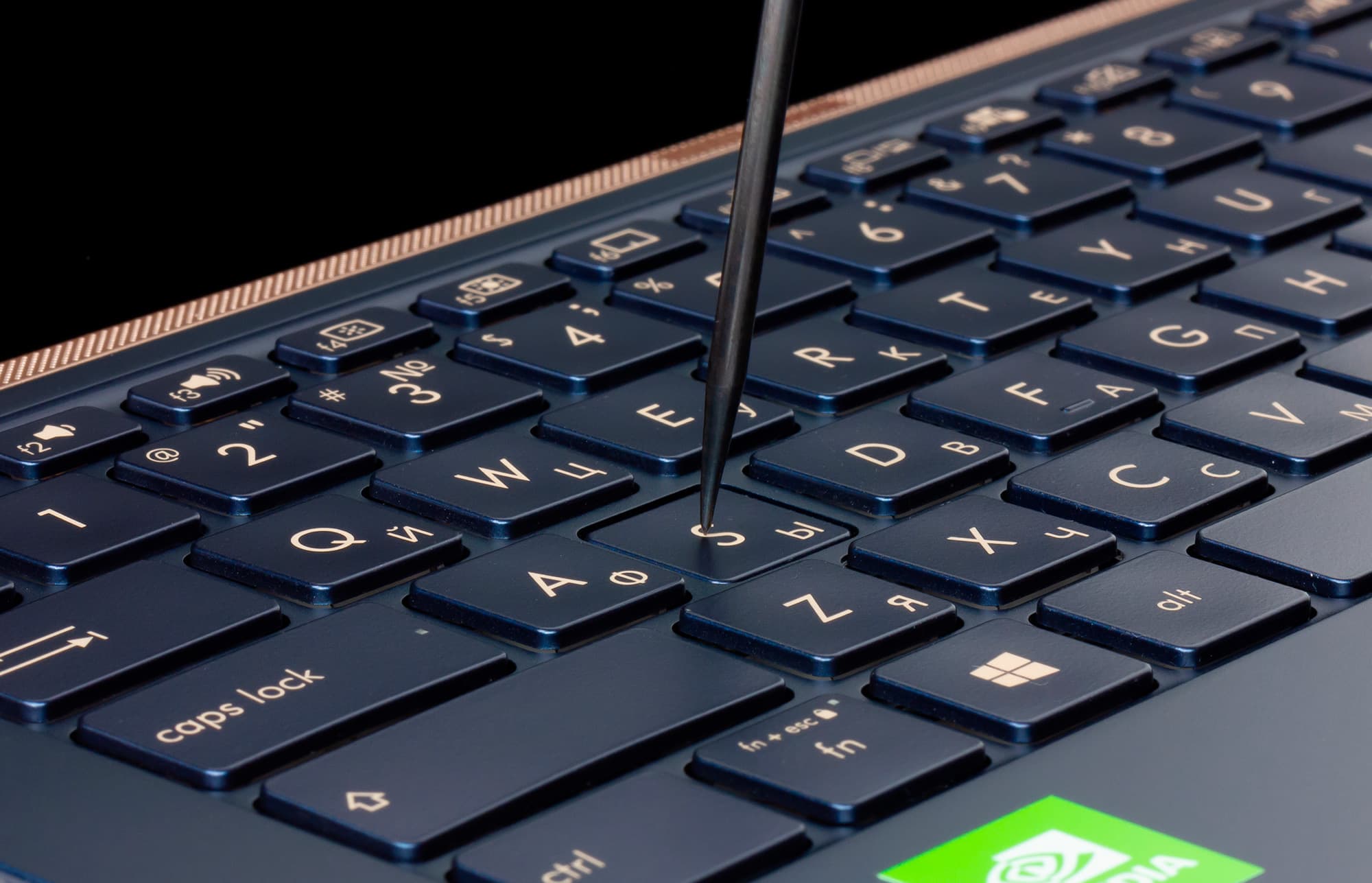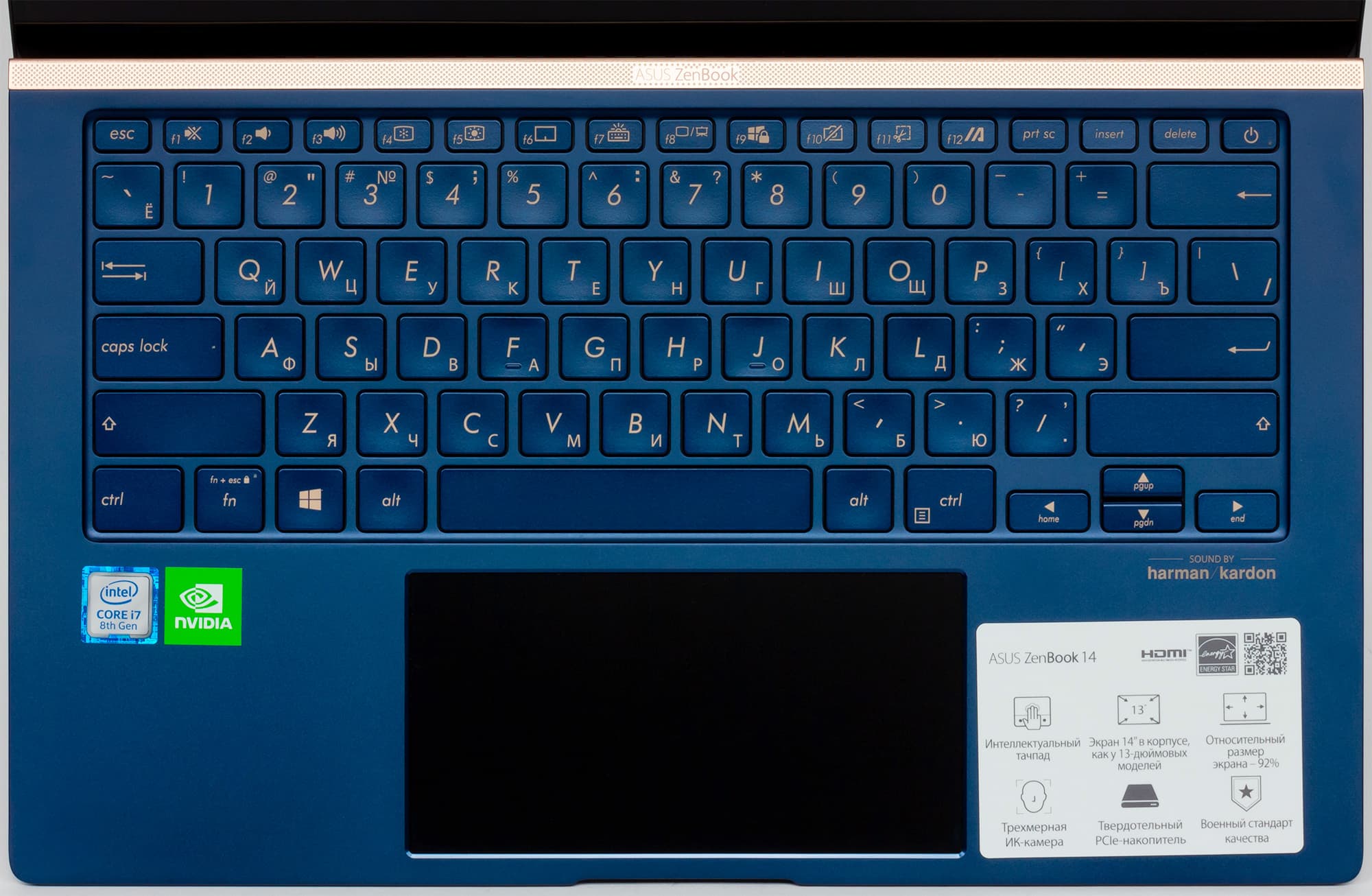 ZenBook 14 UX434F оснащается компактной клавиатурой мембранного типа с основными клавишами размером 15×15 мм и отсутствием цифрового блока. Обе раскладки нанесены хорошо читаемыми золотистыми символами, а сверху проходит линейка функциональных клавиш F1—F12.