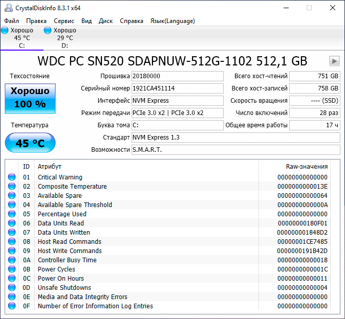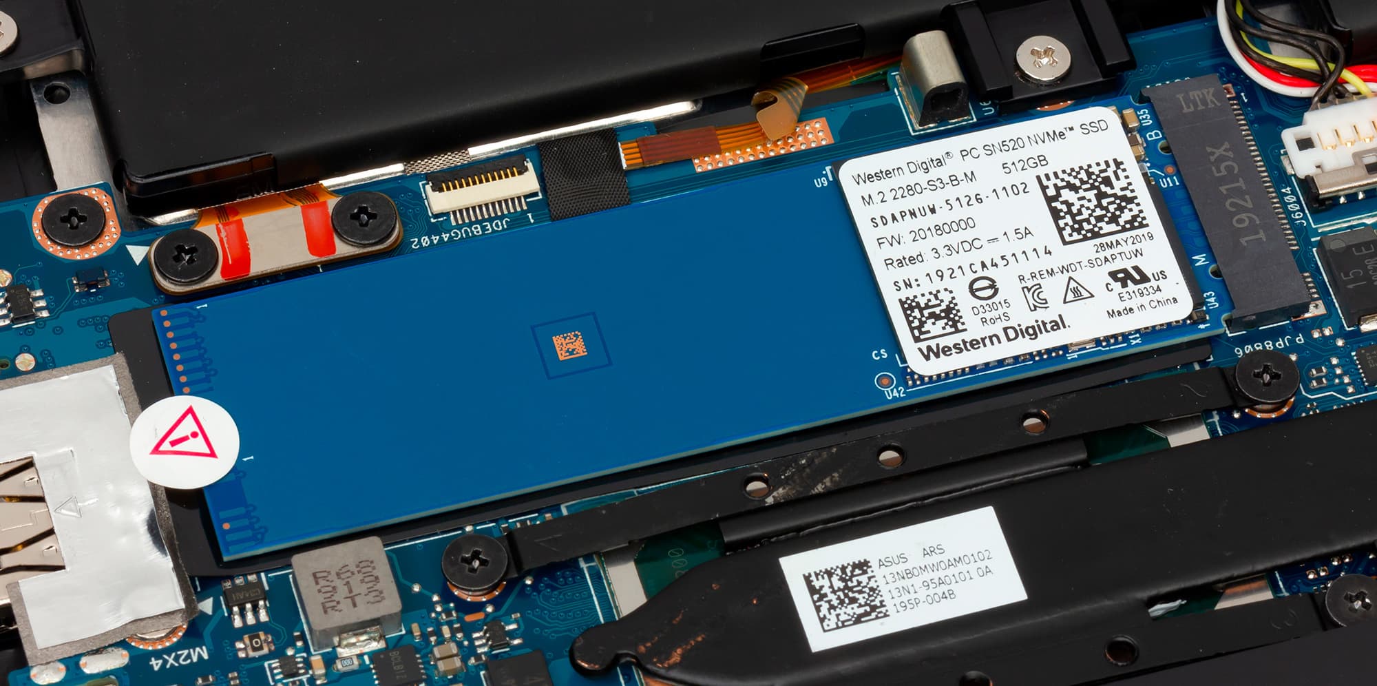 Для работы и хранения данных в ноутбуке установлен NVMe-накопитель SSD (с интерфейсом PCIe 3.0 x2) производства Western Digital — модель SN520 SDAPNUW-512G-1102.