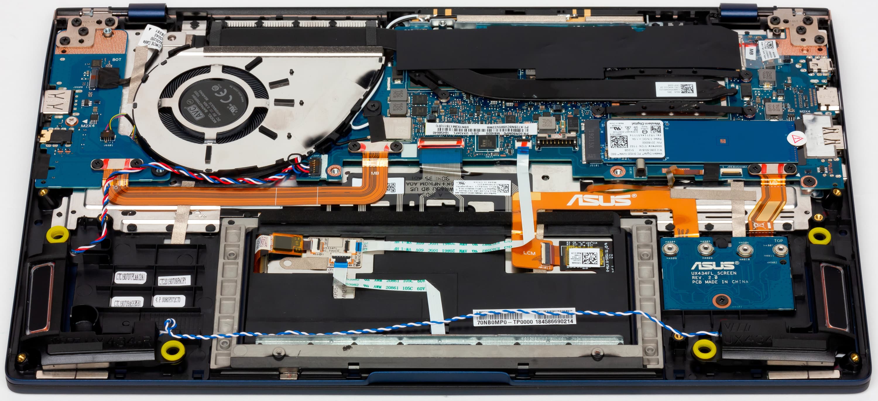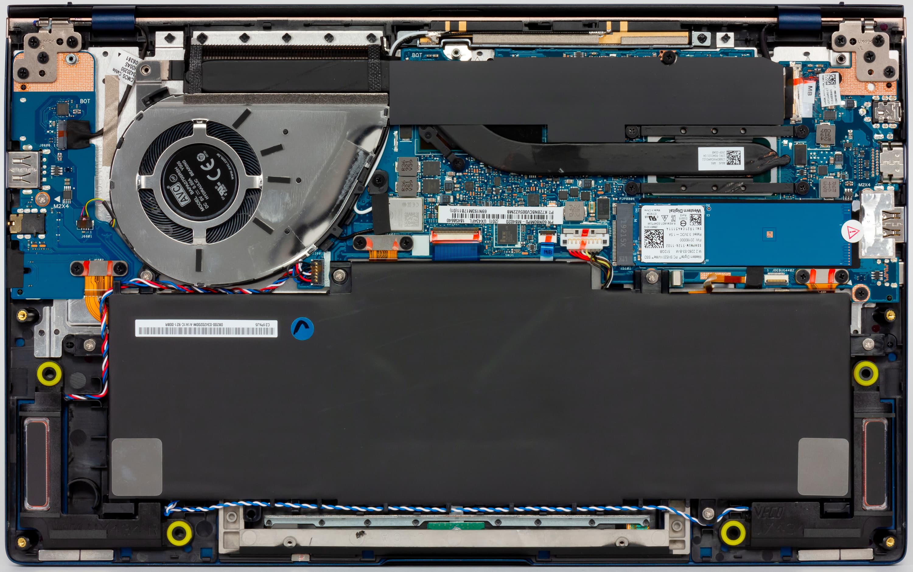 Внутренняя компоновка Asus ZenBook 14 UX434F вполне типична для компактных и тесных внутри моделей. Чтобы изучить аппаратную часть, необходимо снять нижнюю крышку целиком.
