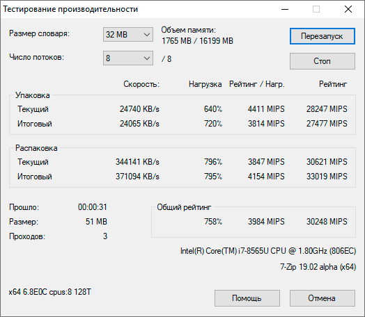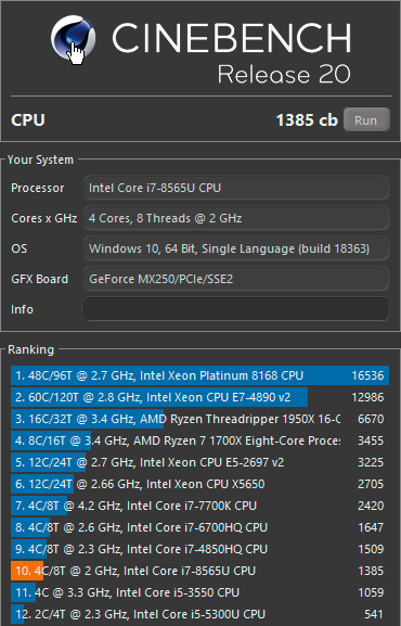 Центральным процессором здесь выступает 14-нанометровый Intel Core i7-8565U с четырьмя ядрами и поддержкой Hyper-Threading. Он работает в частотном диапазоне от 1,8 до 4,6 ГГц при пиковом уровне энергопотребления 25 ватт (15 ватт — типичное значение TDP).