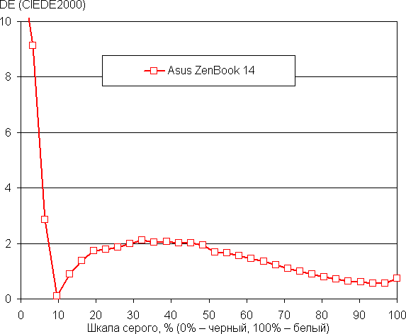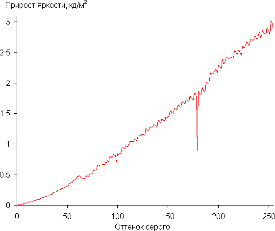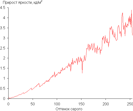 Для основного экрана мы измерили яркость 256 оттенков серого (от 0, 0, 0 до 255, 255, 255). График ниже показывает прирост (не абсолютное значение!) яркости между соседними полутонами: