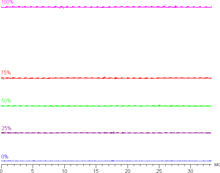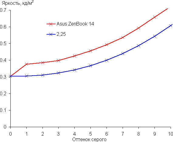 Рост прироста яркости на шкале серого в данном случае более-менее равномерный. В самой темной области хорошо различаются все оттенки, но первый оттенок серого уж слишком яркий: