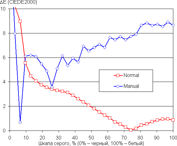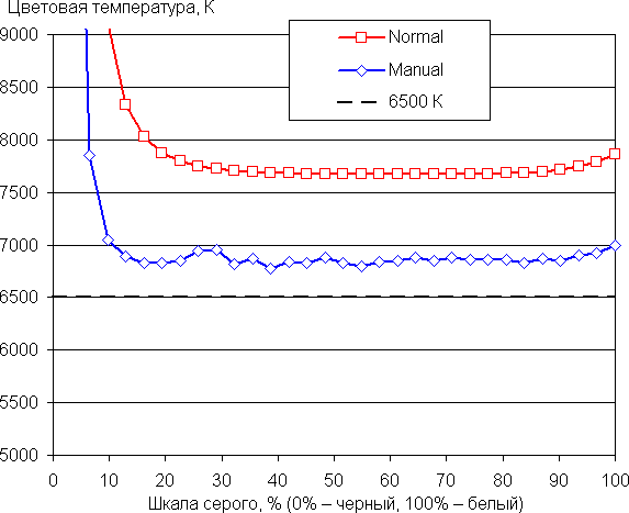 У обоих экранов по умолчанию баланс оттенков на шкале серого немного компромиссный, так как цветовая температура несколько выше стандартных 6500 К. Но критичным это отклонение не является. Отклонение от спектра абсолютно черного тела (ΔE) ниже 10, что для потребительского устройства считается приемлемым показателем. При этом цветовая температура и ΔE мало изменяются от оттенка к оттенку — это положительно сказывается на визуальной оценке цветового баланса. Также мы попытались ползунком цветовой температуры скорректировать цветовой баланс основного экрана, но ничего хорошего из этого не вышло, поскольку показатель ΔE стал возрастать. (Самые темные области шкалы серого можно не учитывать, так как там баланс цветов не имеет большого значения, да и погрешность измерений цветовых характеристик на низкой яркости большая.)