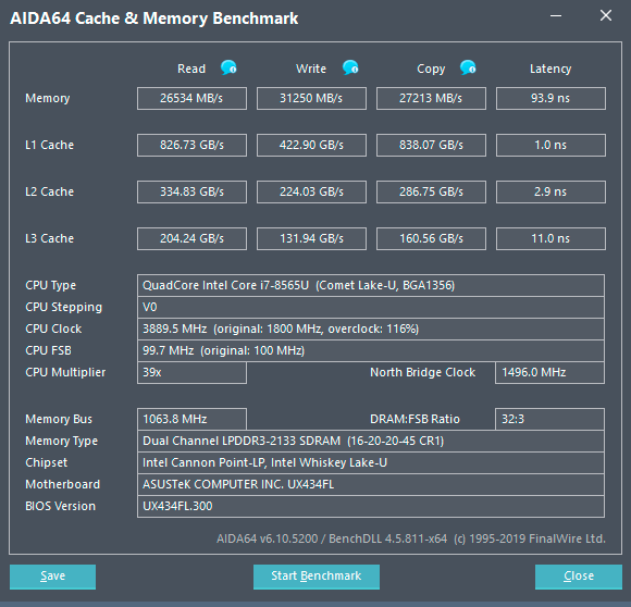С оперативной памятью ноутбука все не очень здорово. Пусть ее объем, набранный двумя LPDDR3-модулями в двухканальном режиме, составляет достаточные для любых мобильных задач 16 ГБ, ее частота равна всего 2133 МГц, а тайминги — лишь 16-20-20-45 при CR1. Неудивительно, что по результатам тестирования пропускная способность памяти и ее задержка оставляют желать лучшего.