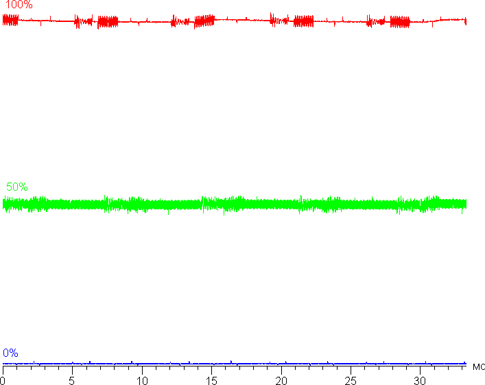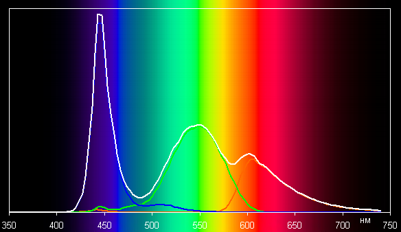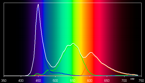 Поэтому визуально цвета имеют естественную насыщенность. Ниже приведен спектр для белого поля (белая линия), наложенный на спектры красного, зеленого и синего полей (линии соответствующих цветов):