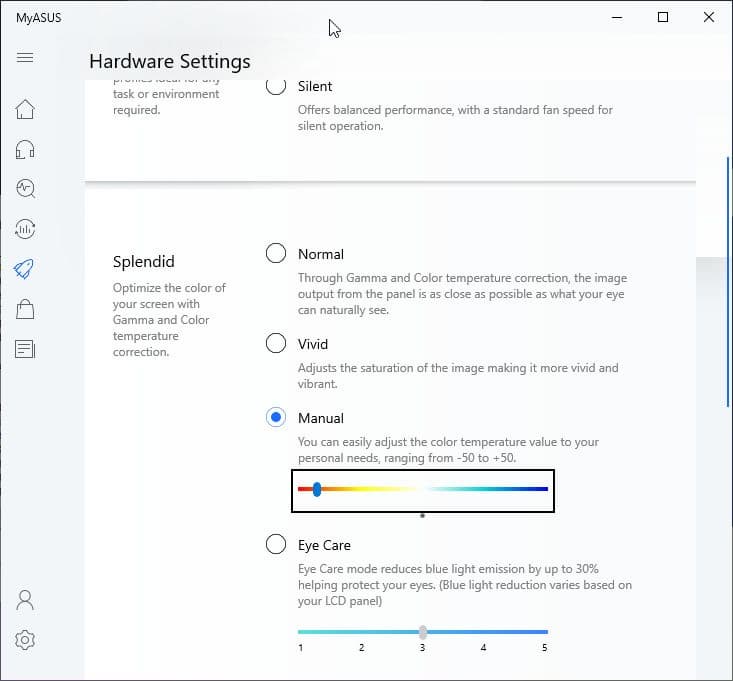 Присутствует фирменная утилита MyAsus, на вкладке которой можно изменить ряд настроек основного экрана: выбрать профиль цветокоррекции и вручную подстроить цветовой баланс. Также есть модная функция (Eye Care) для снижения интенсивности синей компоненты (впрочем, в Windows 10 она и так есть). Почему такая коррекция может быть полезной, рассказано в статье про iPad Pro 9,7″. В любом случае, при работе за ноутбуком на ночь глядя лучше снизить яркость экрана до минимального, но еще комфортного уровня. Желтить картинку нет никакого смысла.