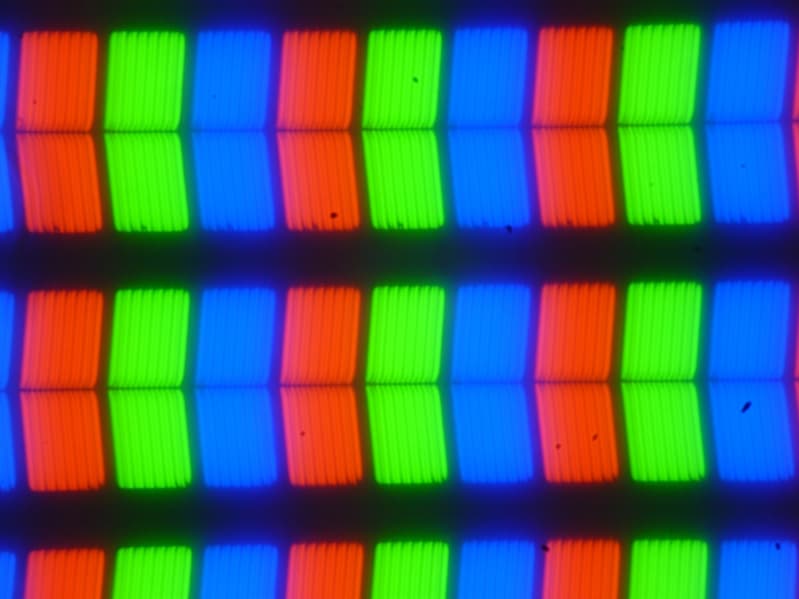 В обоих экранах применяется матрица типа IPS. К сожалению, матовая пленка с относительно крупным зерном не позволяет получить хорошего изображения структуры пикселей в случае экрана-тачпада. Для основного экрана ситуация лучше. Микрофотографии демонстрируют типичную для IPS структуру субпикселей (черные точки — это пыль на матрице фотоаппарата):
