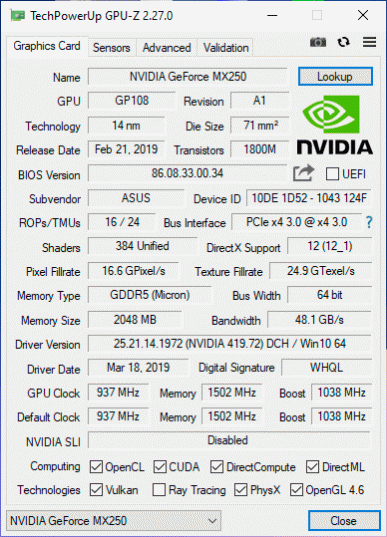 Второе — дискретная видеокарта Nvidia GeForce MX250 с двумя гигабайтами GDDR5 на 64-битной шине при эффективной частоте 6 ГГц.